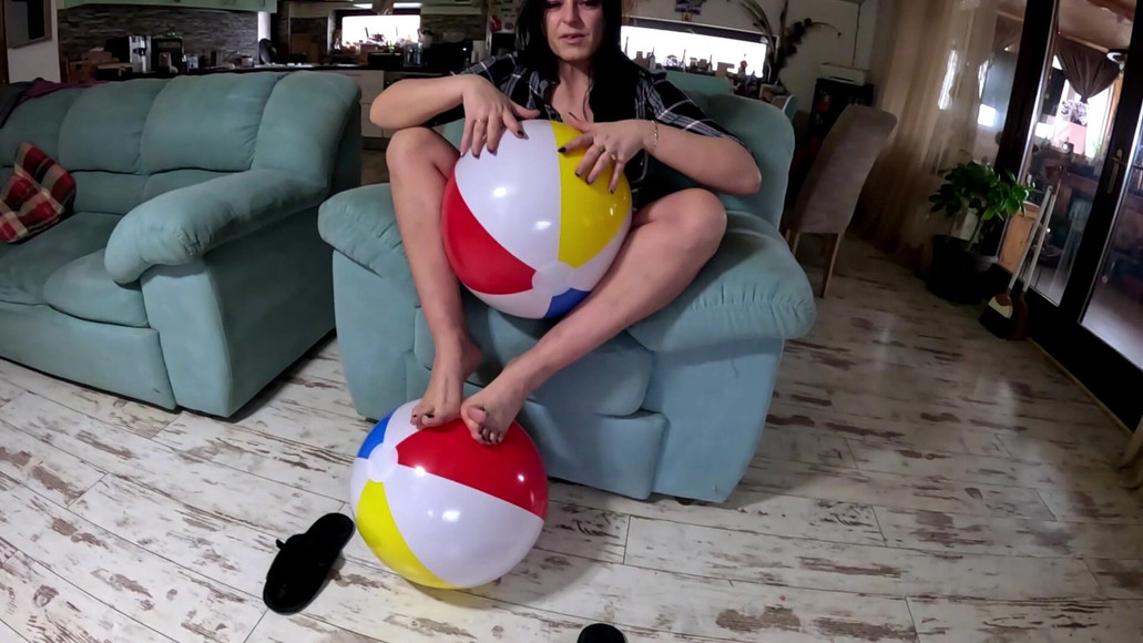 I walk into the room barefoot, wearing tiny tight denim shorts with no panties my cameltoe perfectly visible and the bottom of my ass showing with every move. My shirt is open enough to reveal my breasts and dark polished nails, both on my hands and toes, making every tease even sexier. I bring two big beach balls and start playing with them sensually. I ride them, grind on them, squeeze them between my thighs, and crush them with the upper part of my feet, teasing the camera as my shorts stretch tight around my pussy. I change positions on my knees, on my back, squatting, straddling showing my ass, hips and cameltoe while trying to pop each beach ball using only my legs, toes and thigh pressure. One beach ball bursts when I press it hard with my toes, digging in until the plastic gives way. The second one I destroy slowly at the end, piercing it with my dark-painted fingernails while straddling it, letting the air escape under me in a sexy, controlled crush.